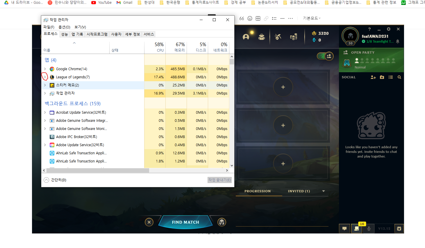 일단 이렇게 롤 화면을 띄우상태로 작업 관리자를 열어주세요.