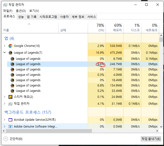 CPU 가장 많이 차지하는 리그오브레전드를 삭제하면
